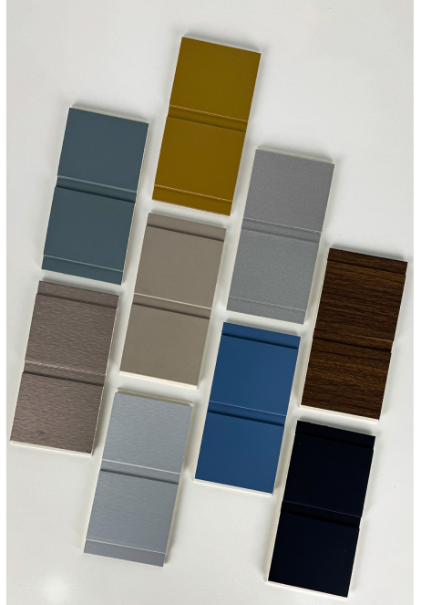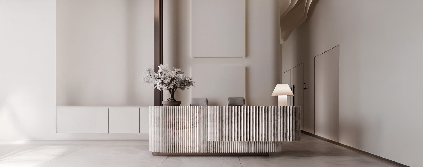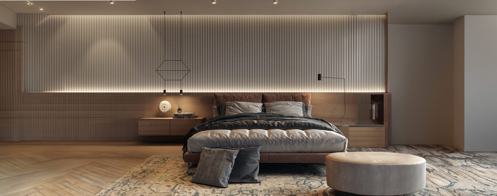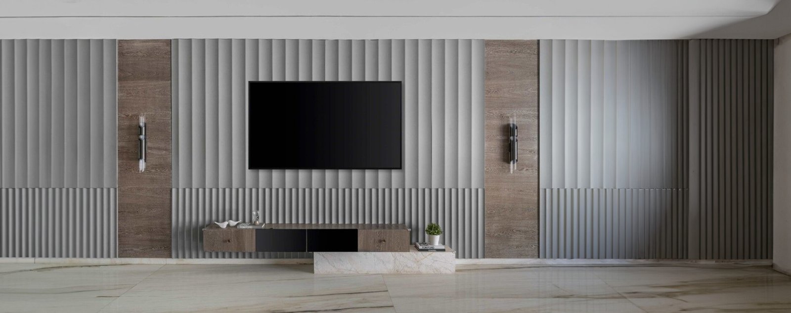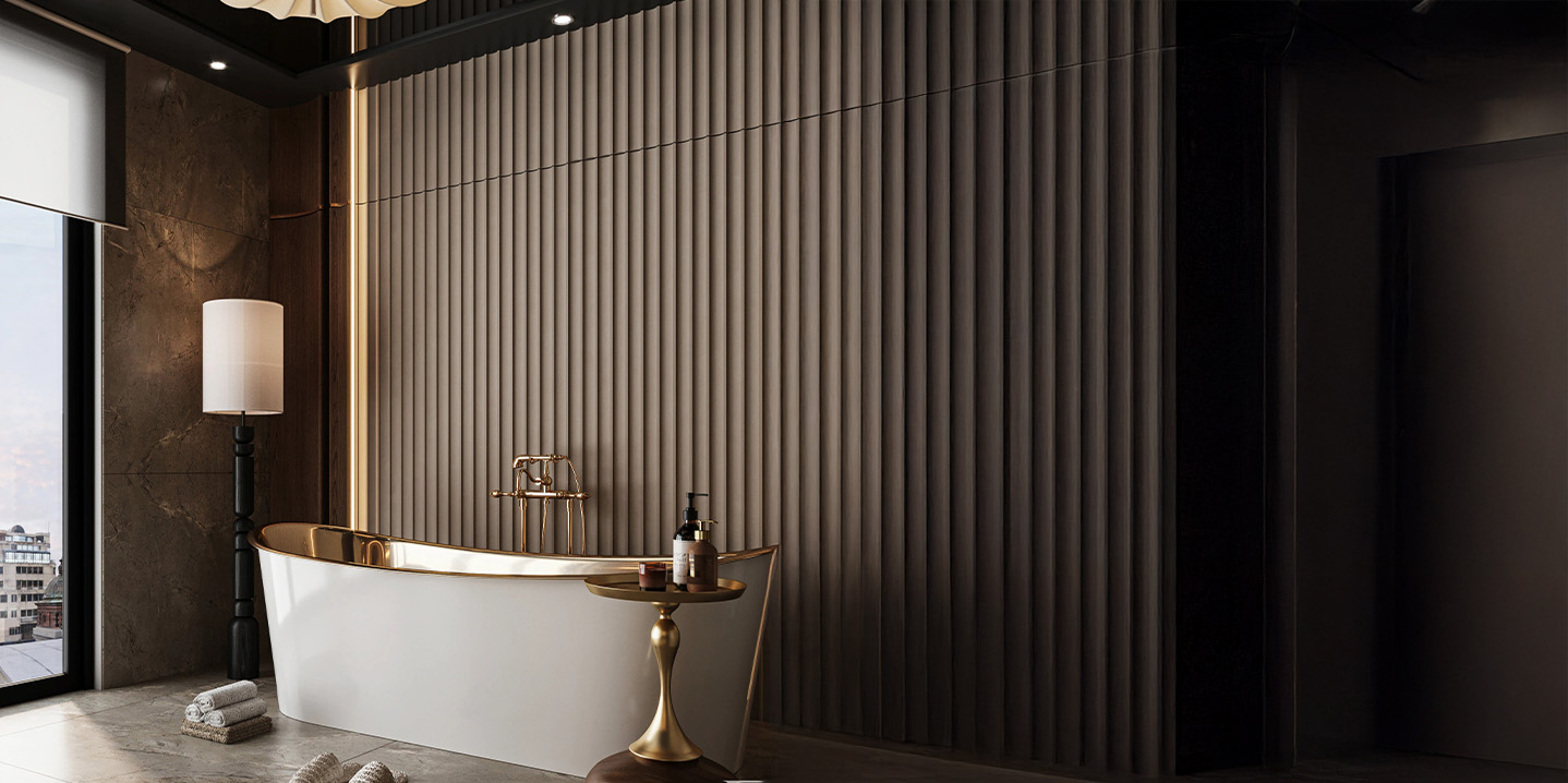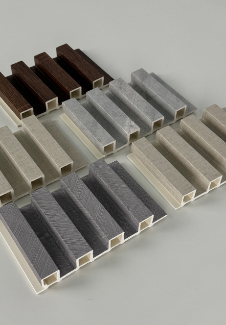 Wallpanel pada gambar memiliki bentuk trapesium beralur vertikal dengan permukaan berundak yang tegas dan modern. Menciptakan tampilan geometris dan ritmis.