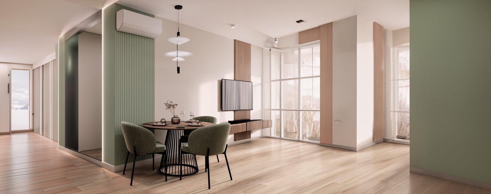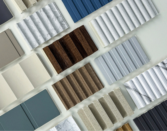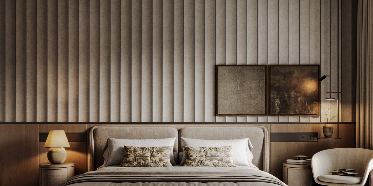 Wallpanel pada gambar memiliki bentuk fluted atau bergelombang vertikal yang memberikan efek visual tiga dimensi pada dinding. Bentuk ini mampu menciptakan kesan ruangan lebih tinggi, elegan, dan modern.