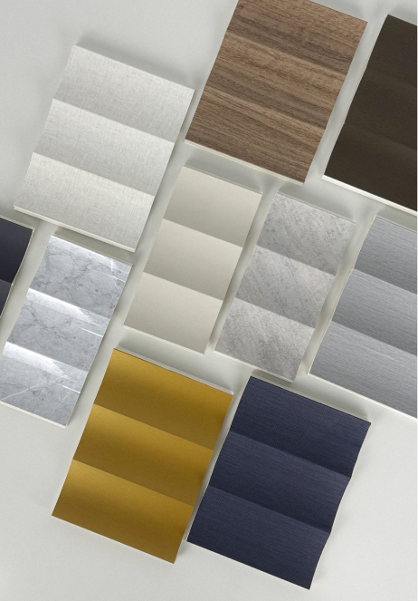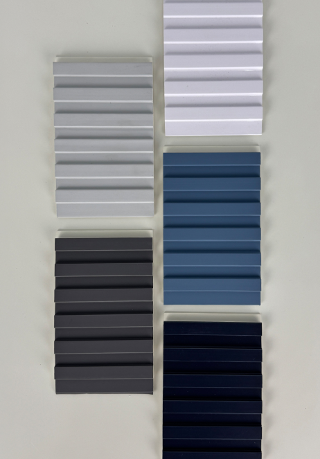 Wallpanel pada gambar memiliki bentuk gelombang kecil dan rapat secara vertikal, menciptakan tekstur visual yang kuat dan dinamis. Desainnya menyerupai sirip atau lipatan kecil yang memberikan kesan ritmis serta kedalaman visual pada dinding.